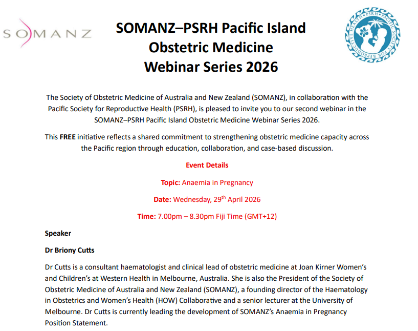 SOMANZ-PSRH Pacific Island Obstetric Medicine Webinar Series 2026